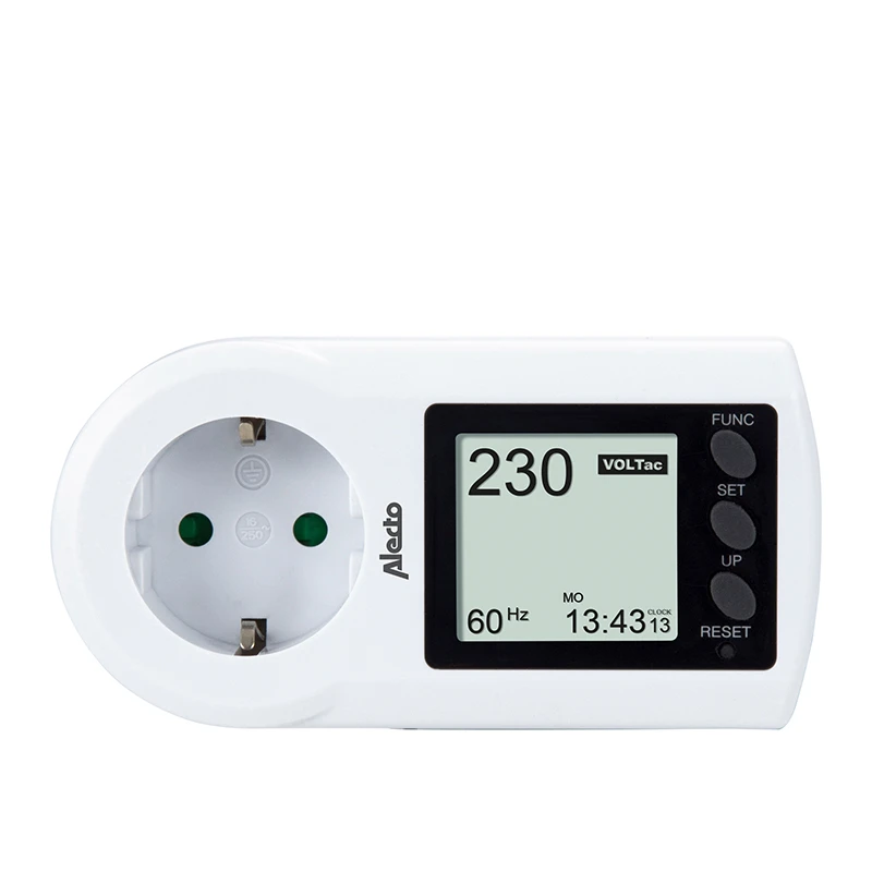 - Skærmen er justerbar, så du kan se alle de værdier, som du har brug for: spænding, volt, strøm i ampere, effekt i watt og det maksimale målte effekt- og strømforbrug