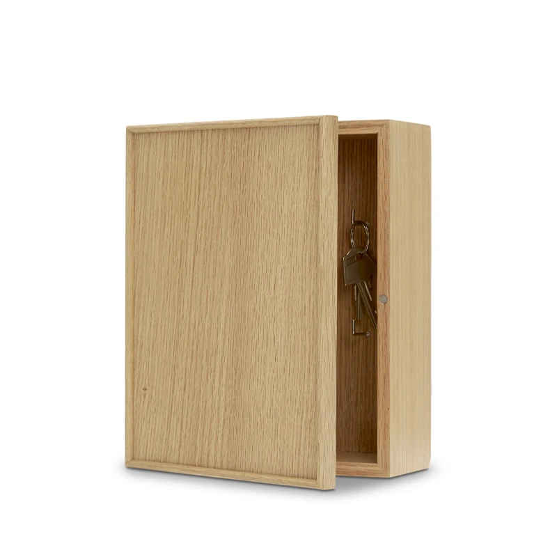 Nøgleskab fra Andersen i egetræ med diskret magnetlås, som gør det nemt at åbne og lukke. Seks kroge inde i skabet til nøgler mm.