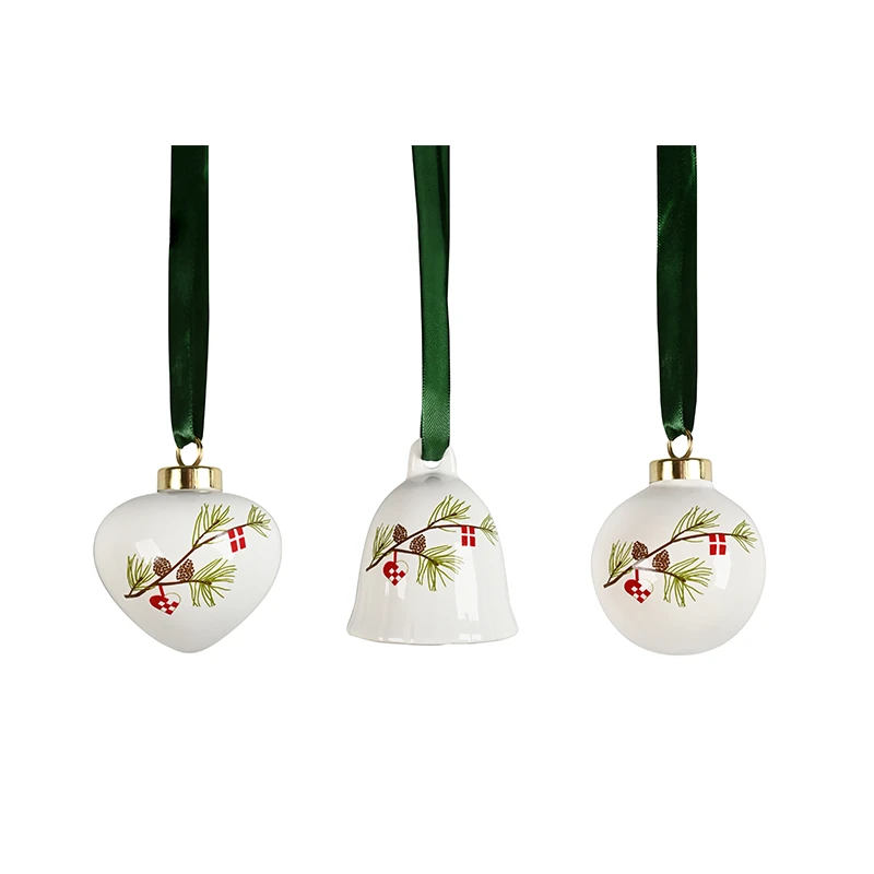 Trænger du til julepynt i vinduet eller på juletræet? Så dekorér dit hjem med disse fine ornamenter fra Det Gamle Apotek. Ornamenterne er med til at skabe en hyggelig og afslappet stemning i hjemmet. Med de fine juledekorationer i keramikken, der viser grankogler og Dannebrogsflag, kommer man helt sikkert i en nostalgisk og traditionsrig julestemning. Sættet består af et hjerte, en kugle og en klokke med fine grønne bånd til ophængning. Glædelig jul!