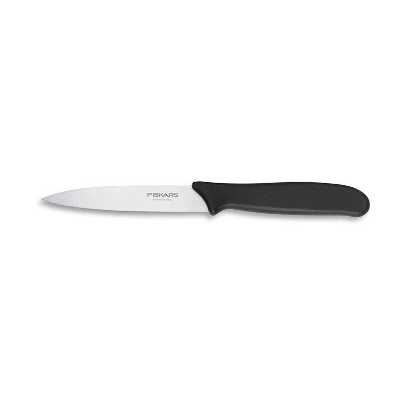 Solid og mellemstor Fiskars kniv, som er særdeles velegnet til frugt og grøntsager. Kniven har et praktisk håndtag der ligger godt i hånden, og gør den rar at arbejde med. Knivbladet er i rustfrit stål.
