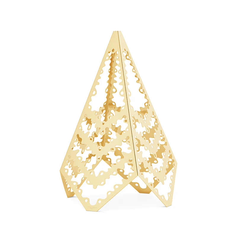 Designeren Sanne Lund Traberg står bag dette års serie af Georg Jensen julepynt. Dette feminine og detaljerige juletræ er fremstillet i rustfrit stål belagt med 18 kt. guld. Dette store juletræ er udsmykket med nærmest blondelignende detaljer, der giver træet den karakteristiske og unikke silhuet.