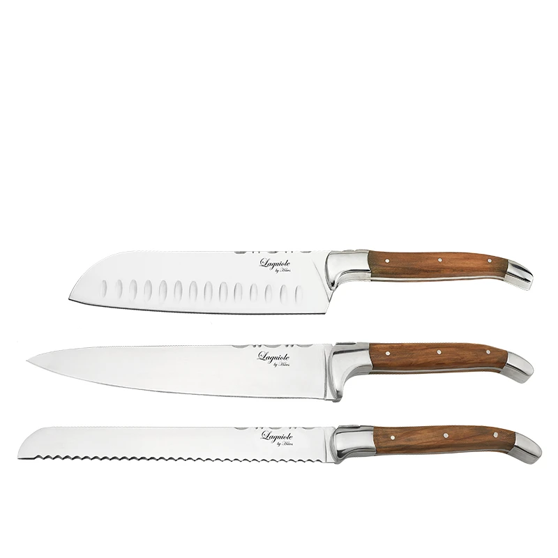 - Alle knivene er i rustfrit stål med et håndtag i oliventræ