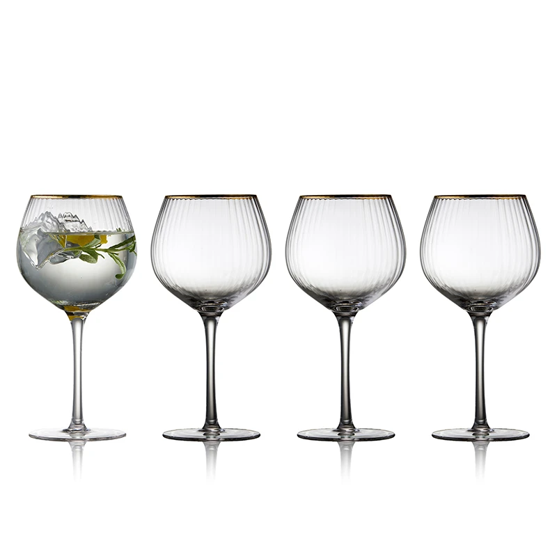 Smukke gin & tonic glas i bløde, runde former. Glassene har et elegant riflet design med en guldkant der giver et flot vintagelook.