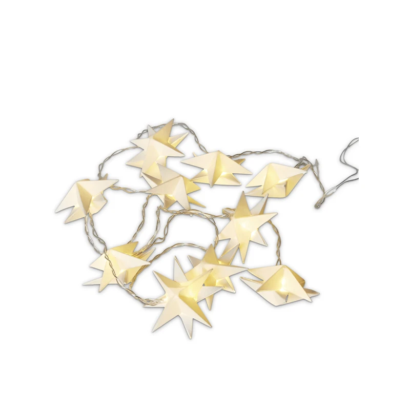 Lyskæde 10 LED lys med stjerner i hvidt papir. Stjernerne måler Ø8cm. Med batteriboks. Til indendørs brug.