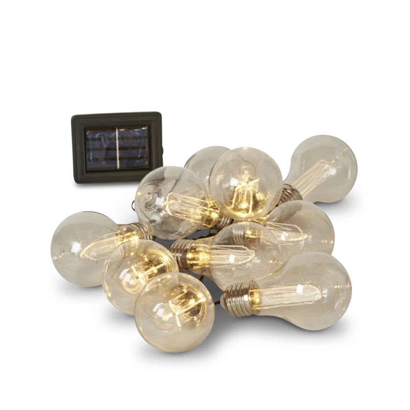 Solcelledrevet lyskæde med 10 pærer, som lyser med et varmt hvidt lys. Sort ledning med pærer i klar plast. Der er 20 cm afstand mellem hver pærer. Fra sidste pærer til stik er der 2 meter ledning.