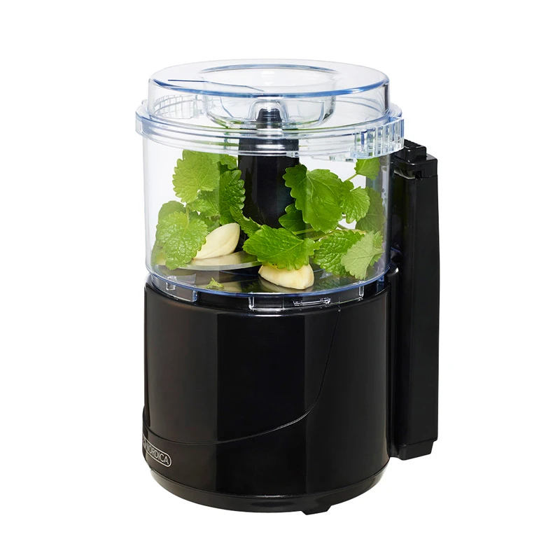 Nem og hurtig hakning af nødder, løg, kød, persille m.m. 4.500-5.000 omdrejninger min. Sikkerhedsmekanisme. Gummifødder. Ledningsoprul. Knivblade i rustfrit, nikkelfrit stål. Væske kan påfyldes gennem låget under brug. 150 watt.