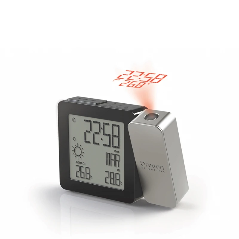 Regntøj på cykelturen? Ville det ikke være rart at vide inden du overhovedet er stået ud ad sengen? PROJI vækkeuret fra Oregon Scientific er ikke bare et vækkeur men også en lille vejrstation, da den giver dig temperaturen (både inde og ude), klokkeslættet, datoen og vejret på én og samme tid. Med den smarte vinkeljustérbar projektionsarm, kan du blive liggende i sengen og se klokkeslættet bliver projekteret med røde tal på væggen eller på loftet – så er det nemt lige og se, om man kan snooze i 10 min. mere. Uret har udover snooze-funktion også en stigende alarm, så du vågner på en behagelig måde. Uret bruger 2 x AAA-batterier som medfølger.