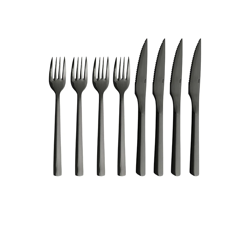 Sættet består af 4 x kniv 23 cm, 4 x gaffel 20,3 cm
