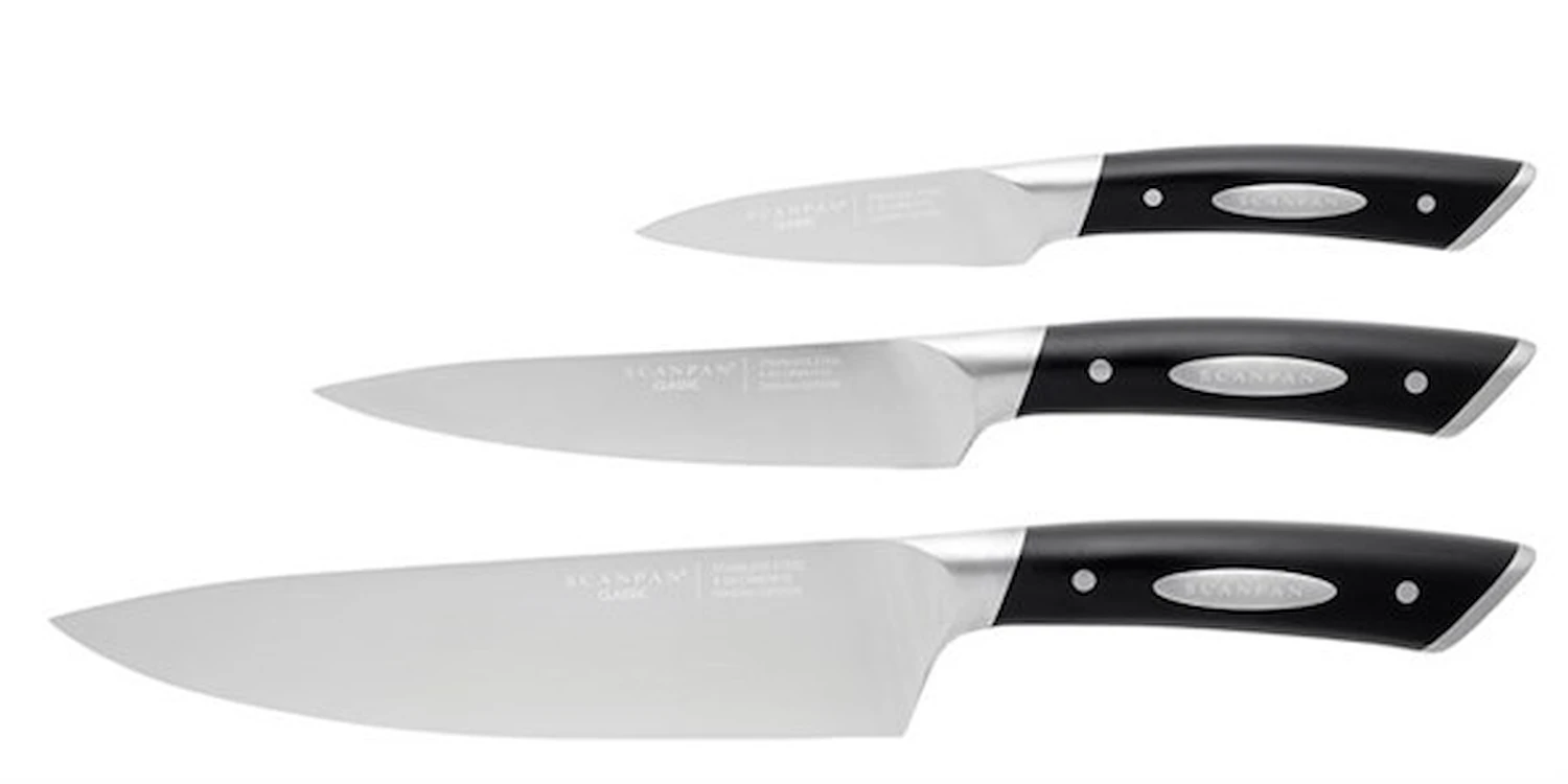 I dette smarte knivsæt med 3 knive fra Scanpan får du 1x 9 cm urtekniv, 1x 15 cm forskære og 1x 20 cm kokkekniv. Med dette sæt får du altså 3 gode knive til hverdages madlavning. Urtekniven kan bruges til alt lige fra at skære urter til at skrælle æbler – den er perfekt til de opgaver i køkkenet , der kræver præcision.