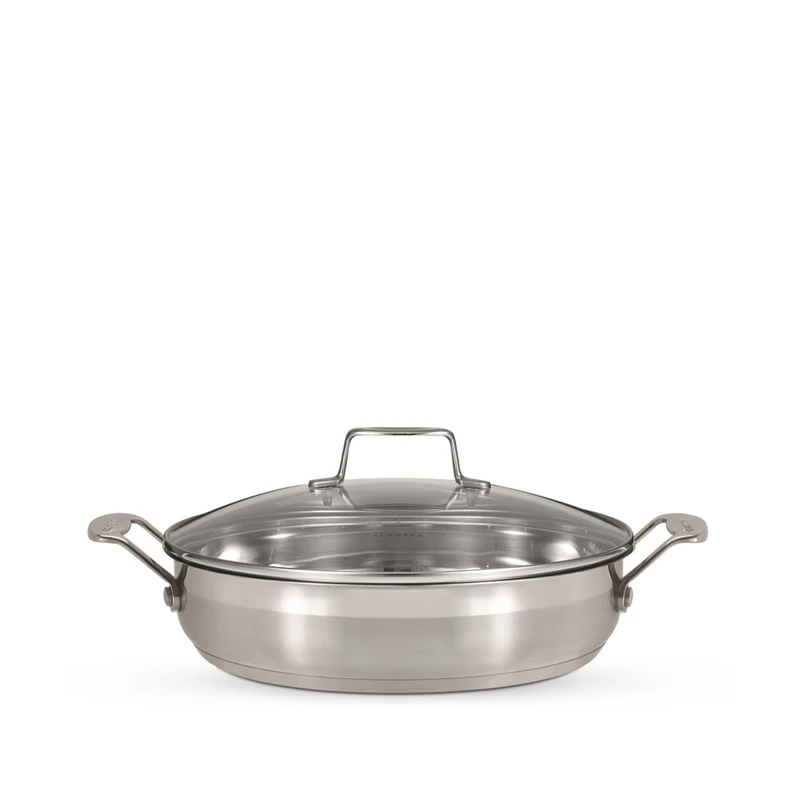 Denne chefpande fra Scanpan Impact-serien er fremstillet i slidstærkt 18/10 rustfrit stål med en bundkerne i aluminium for optimal varmelederne effekt. Panden er derfor utrolig holdbar og fordeler varmen godt. Modsat en sauterpande har chefpanden to korte greb, der gør den ideel til servering. Håndtagene er også fremstillet i rustfrit stål, som sikrer at de holder sig køligere i længere tid. Med den specialdesignede kant kan du hælde fra panden, uden at bekymre dig om at dryppe. Indvendigt er der desuden mulighed for at aflæse mål. Panden tåler helt op til 260°C. Dette gælder også låget, der er fremstillet af hærdet glas. Du kan derfor sagtens komme panden i ovnen, hvis opskriften lyder sådan. Panden passer til alle varmekilder – også induktion. Scanpan yder 5 års garanti på dette produkt. Scanpan yder 5 års garanti på dette produkt.