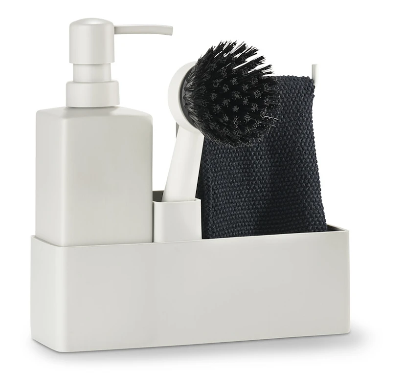 Sæbedispenser, opvaskebørste, karklud og holder.